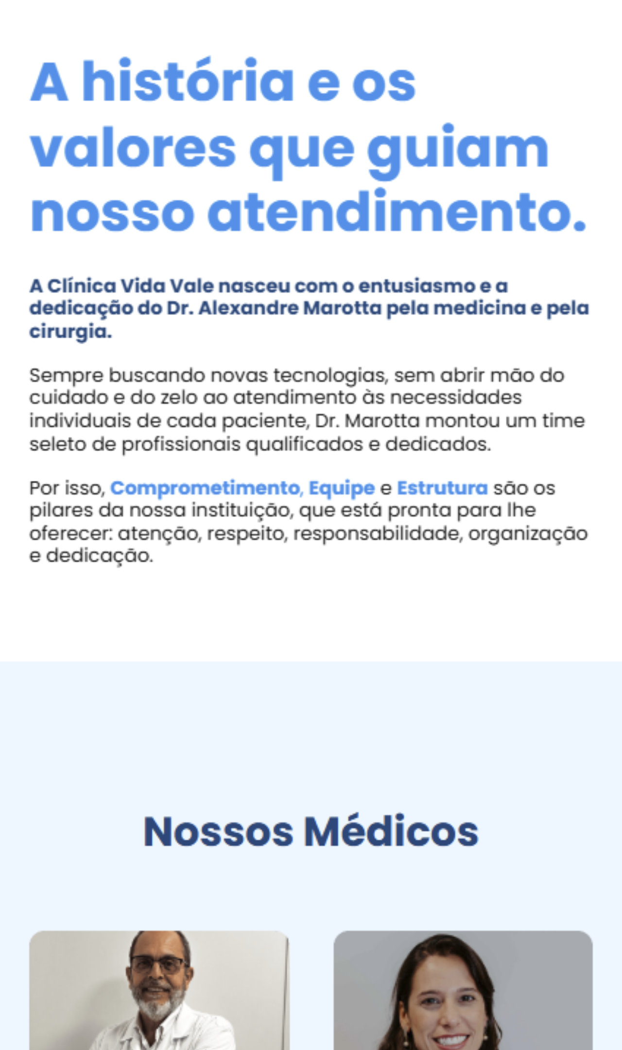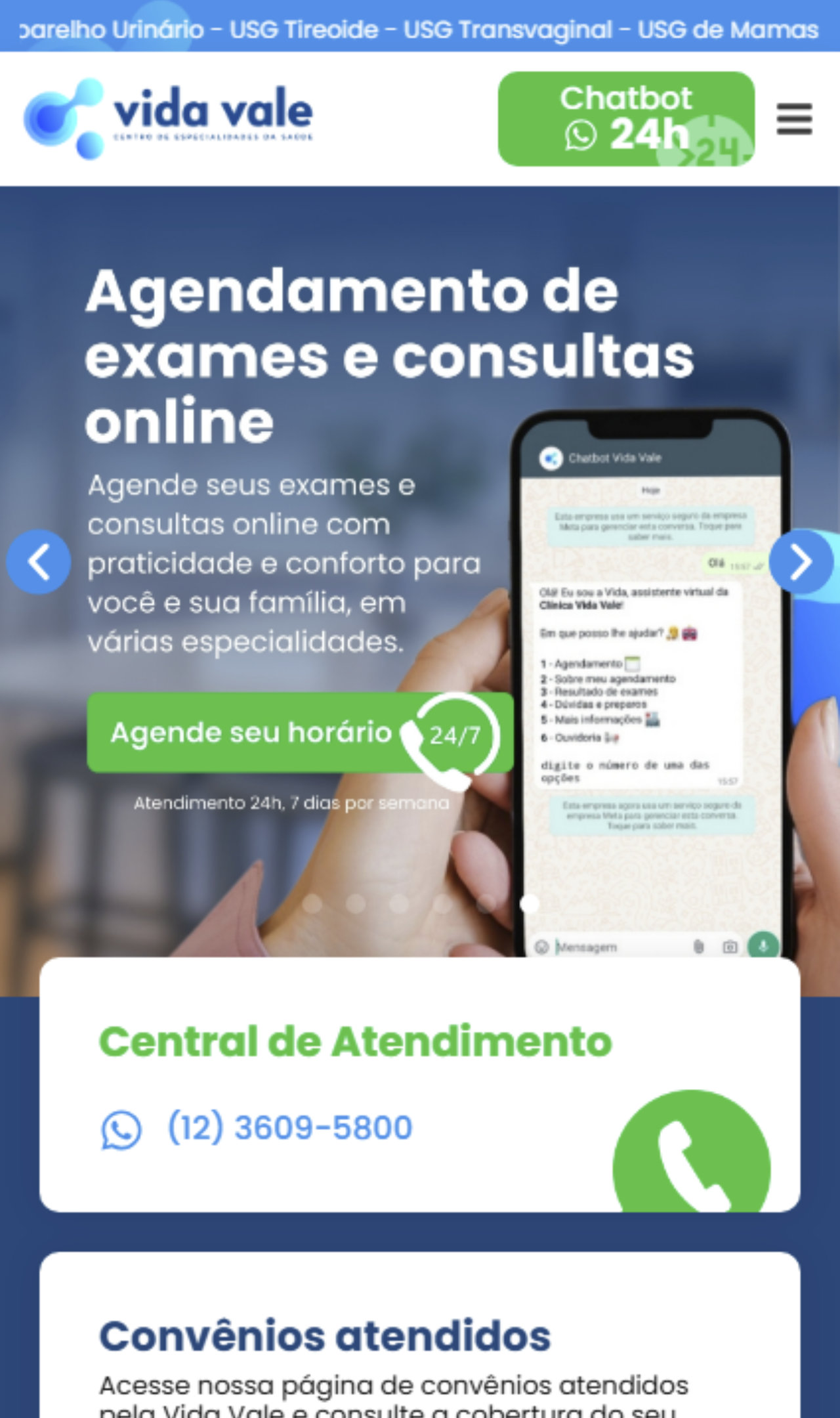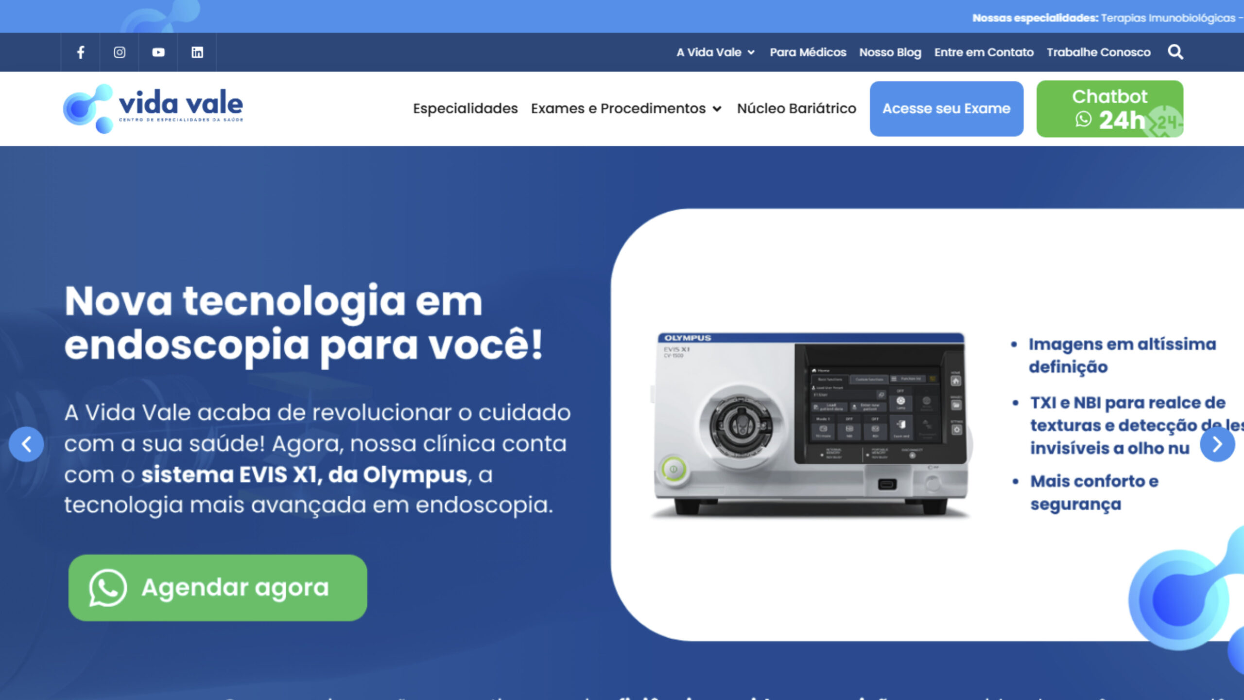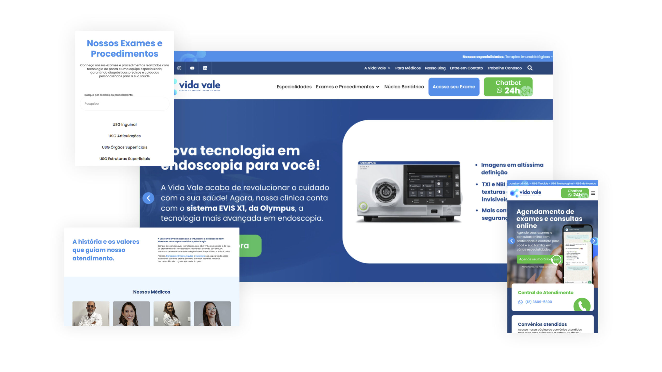 A apresentação das especialidades, exames e equipe médica reforça a credibilidade da instituição, transmitindo confiança desde o primeiro acesso.