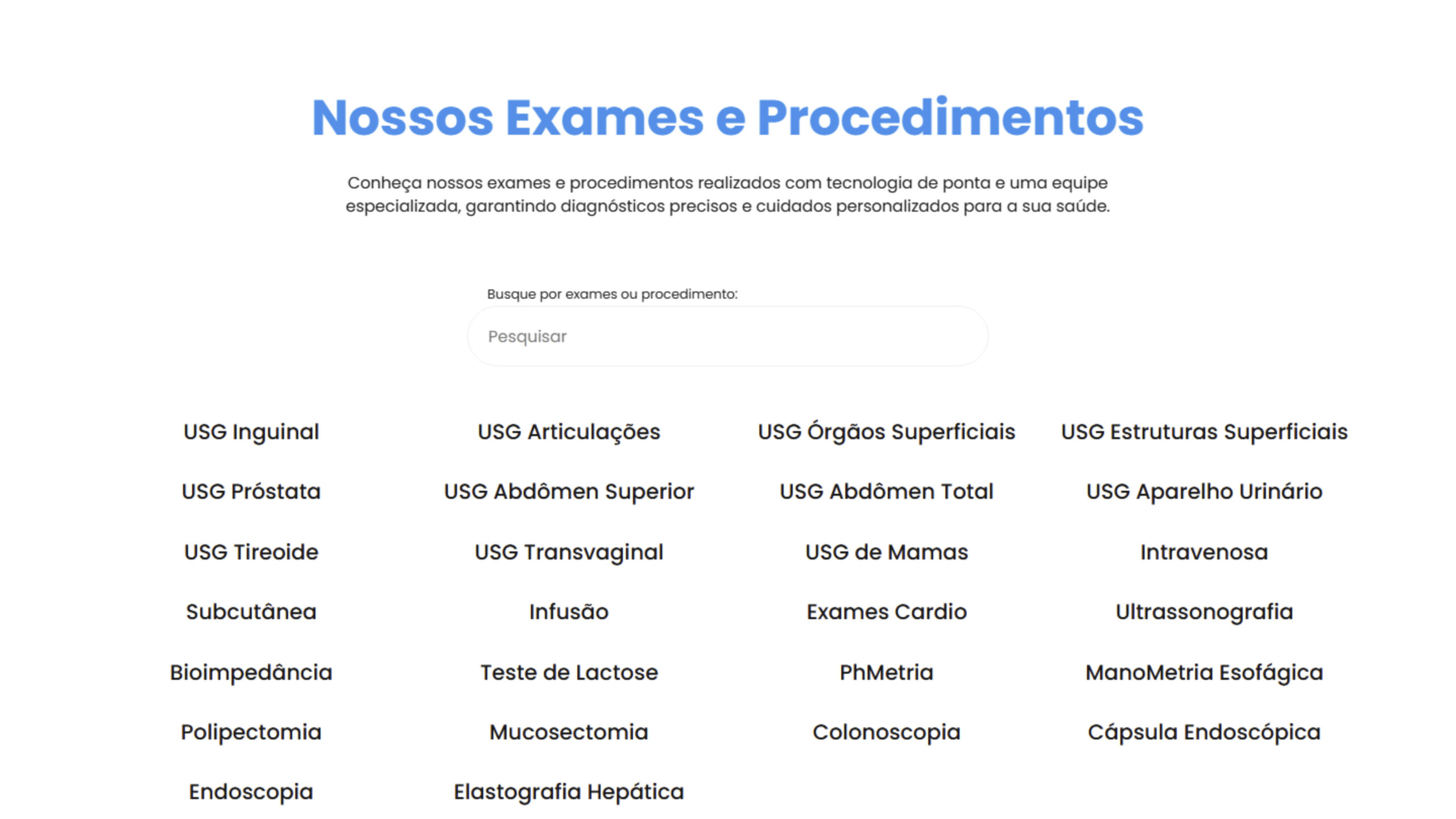O site foi estruturado para oferecer uma navegação fluida, com menus intuitivos, busca por exames e procedimentos e acesso rápido às principais informações. Cada seção foi pensada para facilitar a tomada de decisão do usuário, reduzindo barreiras no agendamento e no contato.