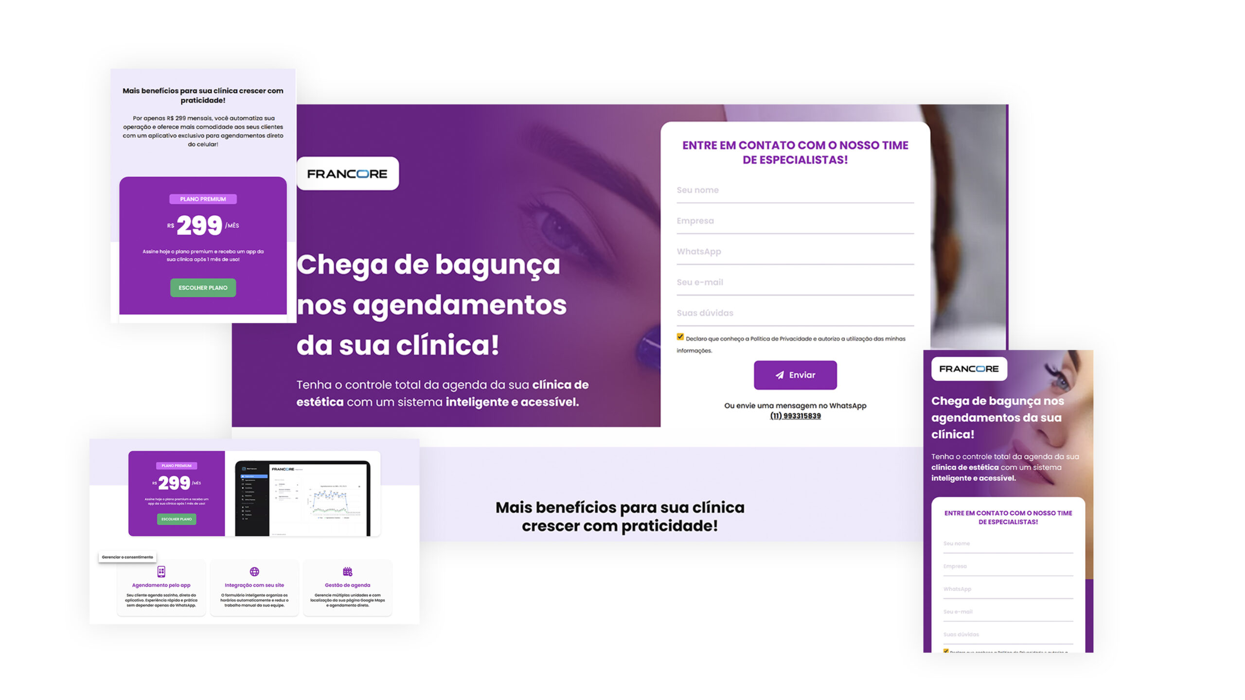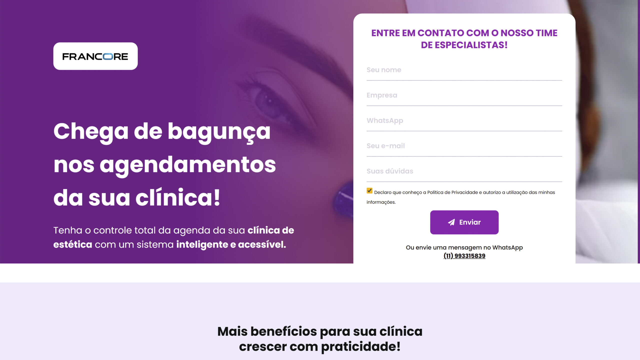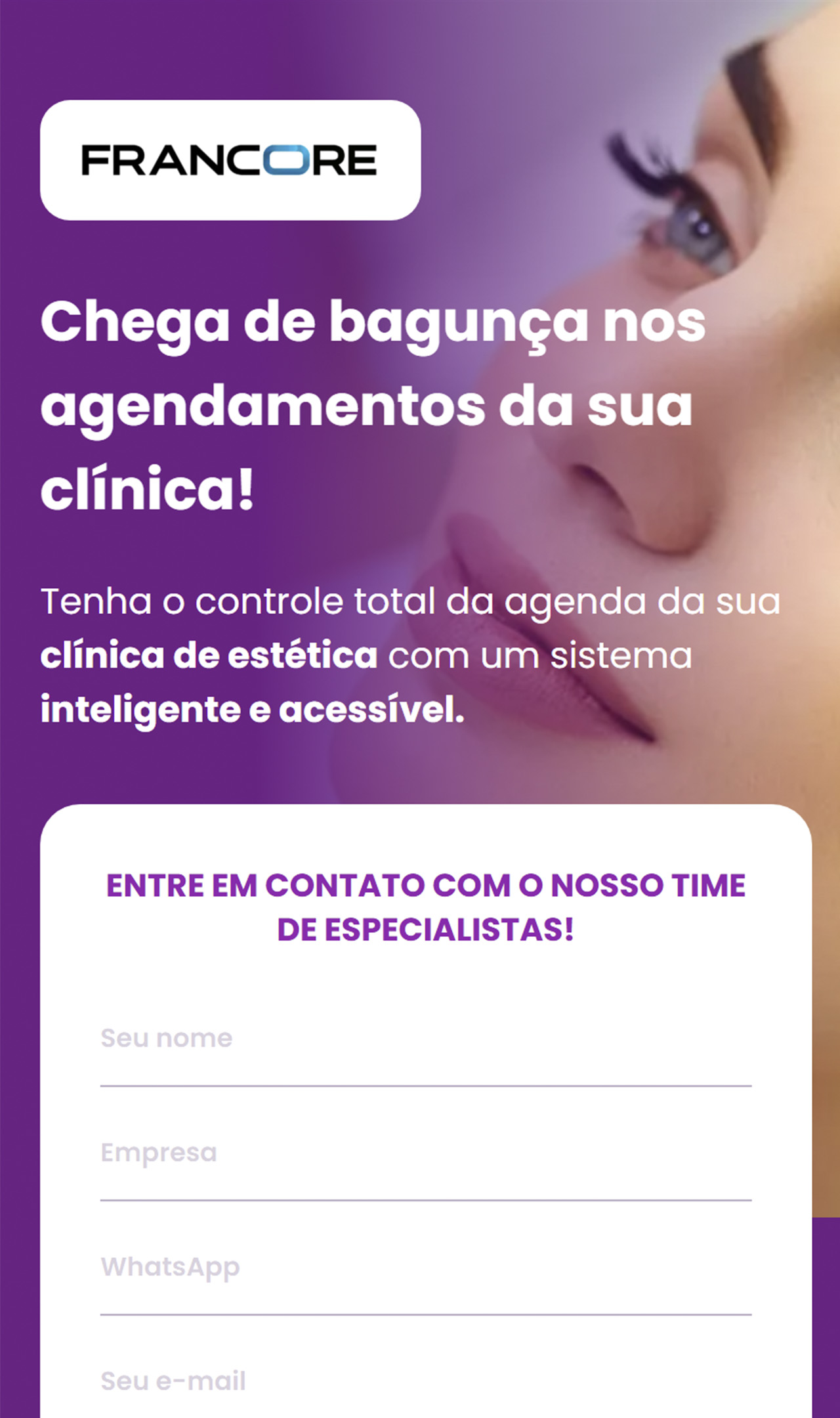 Uma empresa especializada em soluções digitais para clínicas de estética recebeu uma nova landing page com foco em captação de clientes. O objetivo foi transmitir modernidade, praticidade e credibilidade, além de destacar os benefícios da automação nos agendamentos e gestão integrada.
