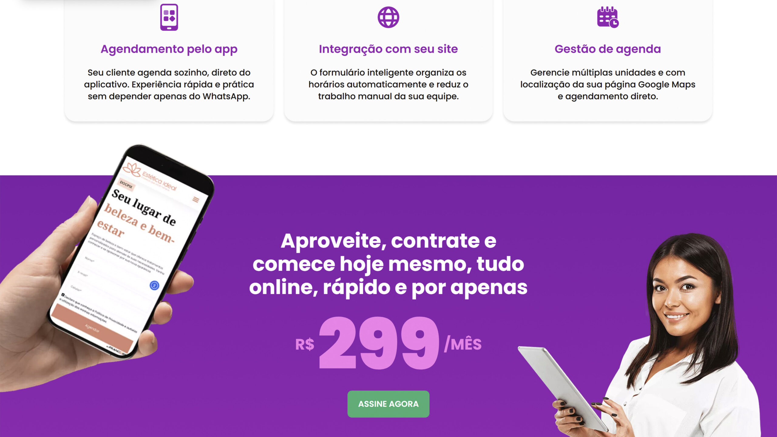 Entre as funcionalidades estão: agendamento online pelo aplicativo, integração inteligente com o site da clínica e gerenciamento de múltiplas unidades com geolocalização.