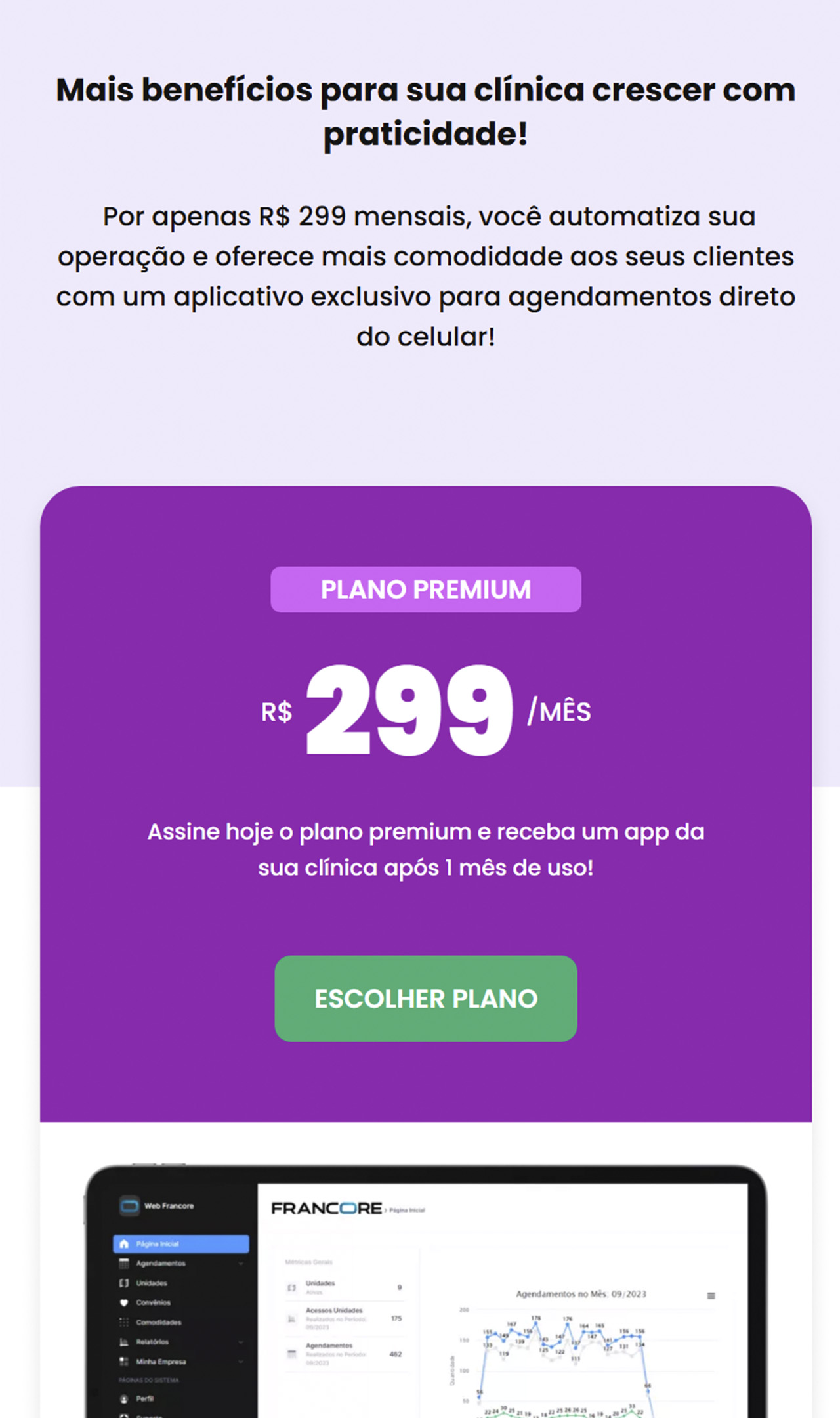A headline “Chega de bagunça nos agendamentos da sua clínica” cria identificação imediata com a dor do público-alvo.