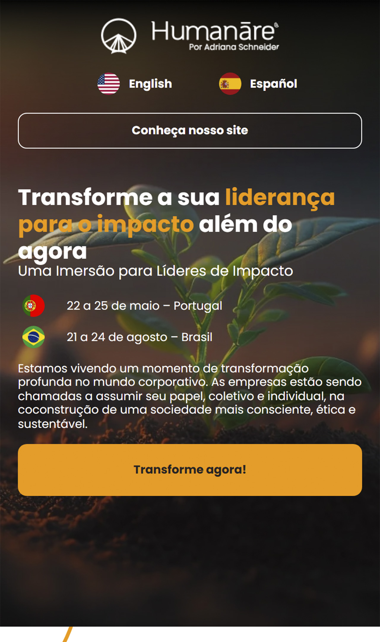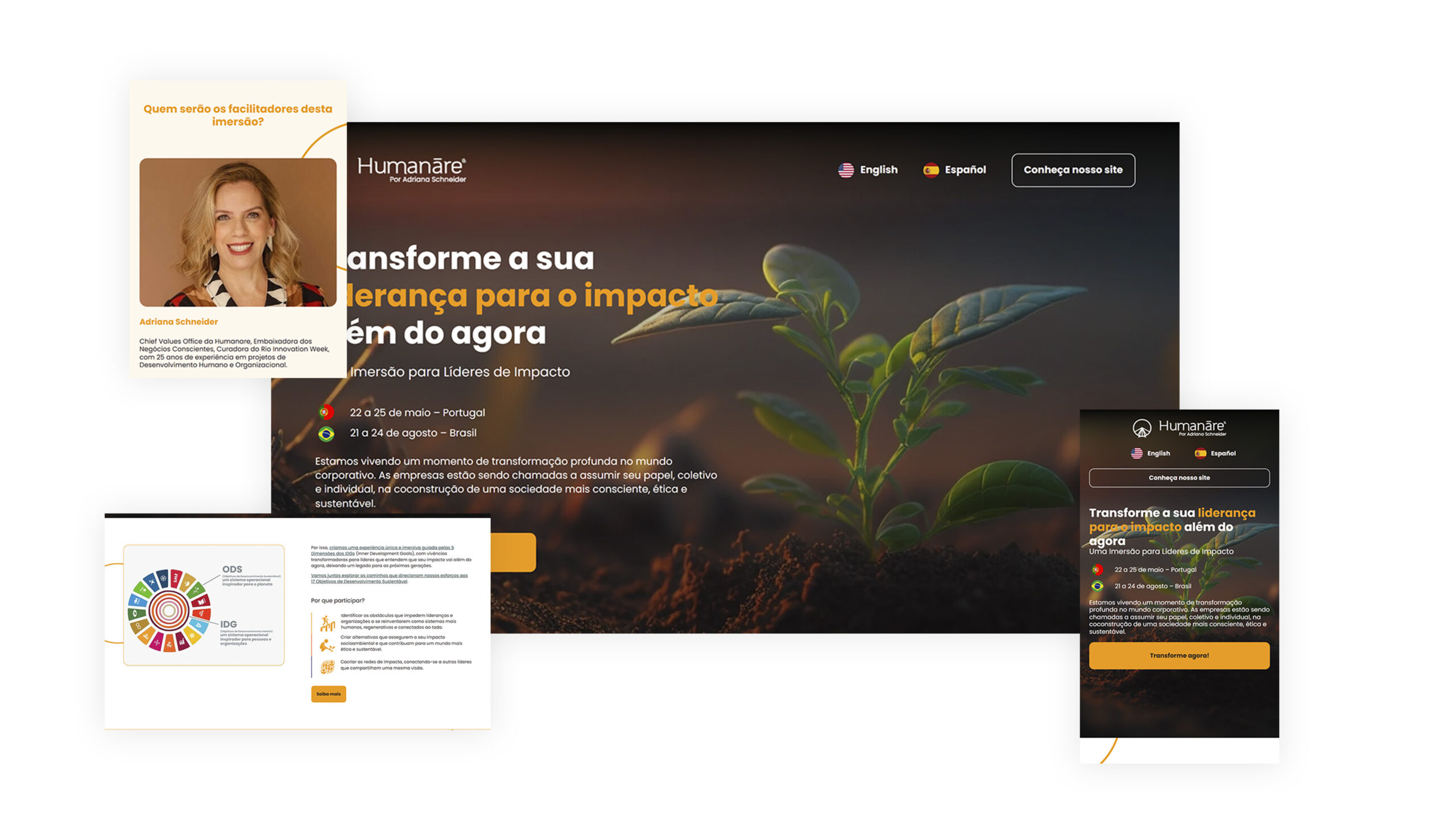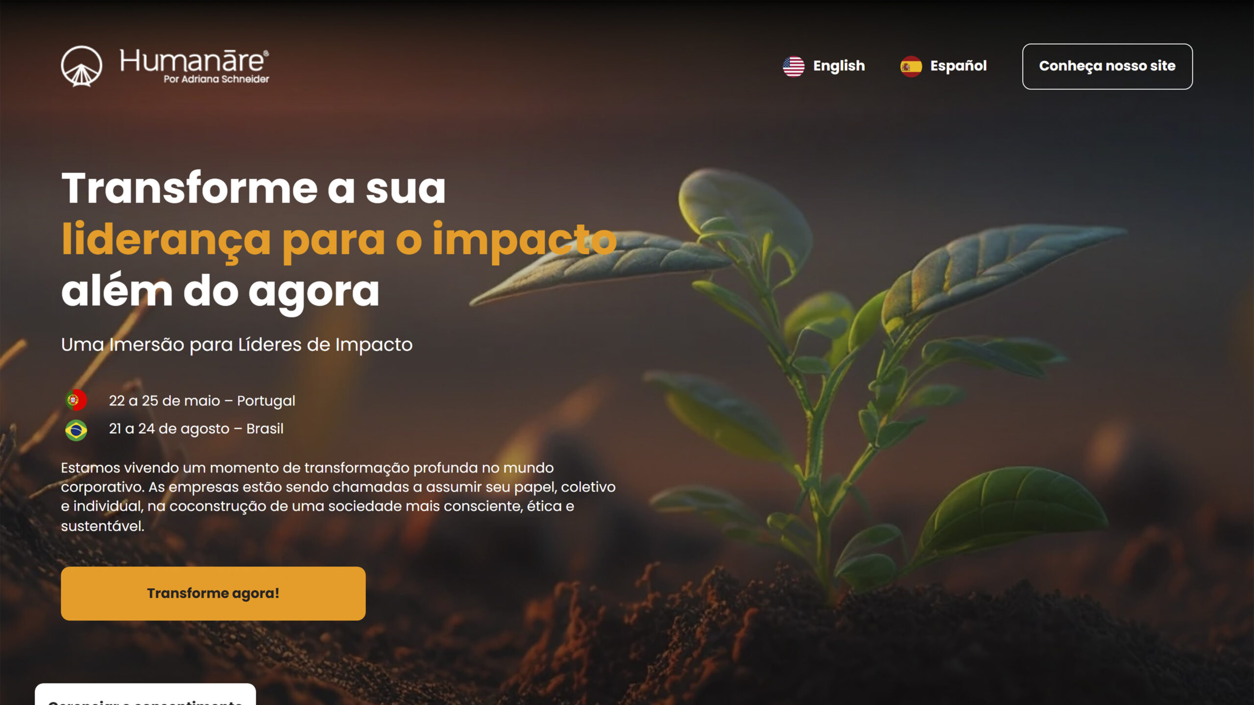Uma consultoria especializada em desenvolvimento humano lançou uma imersão internacional para líderes de impacto, com o objetivo de preparar executivos e gestores para atuarem de forma consciente, sustentável e regenerativa. Para isso, foi criada uma landing page estratégica, com foco em engajamento, impacto e captação de inscritos.