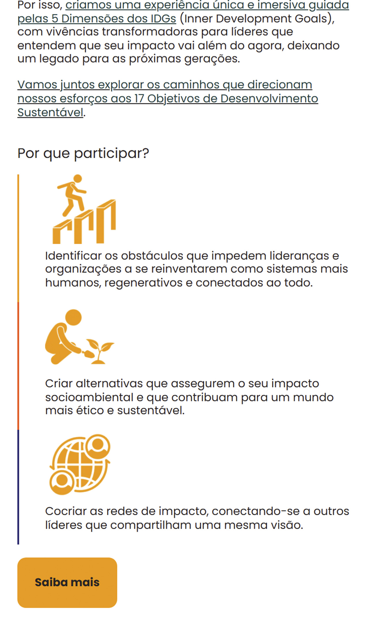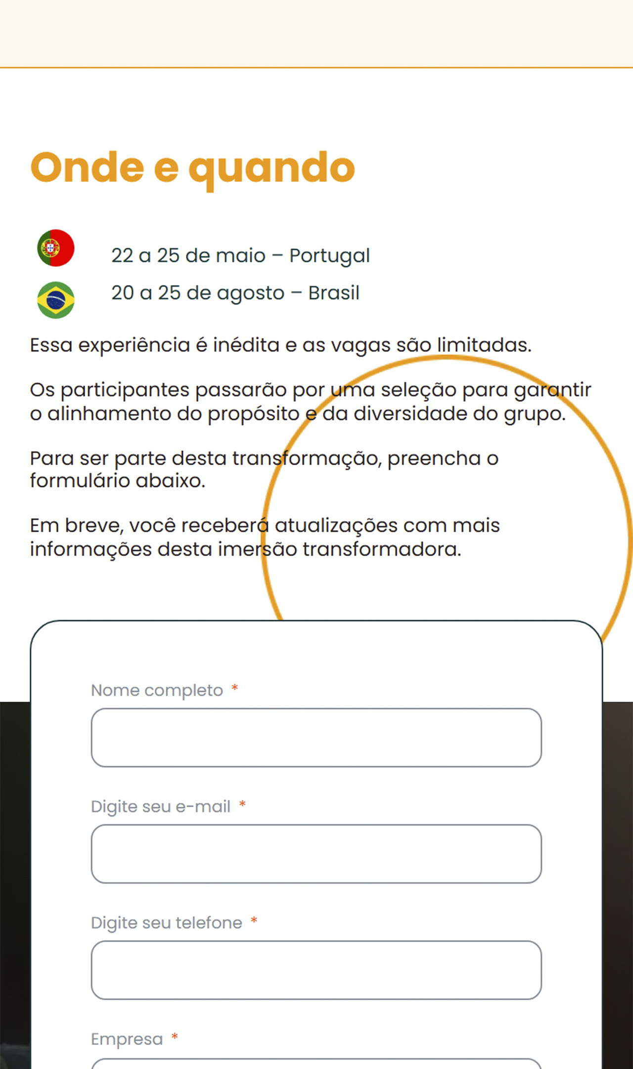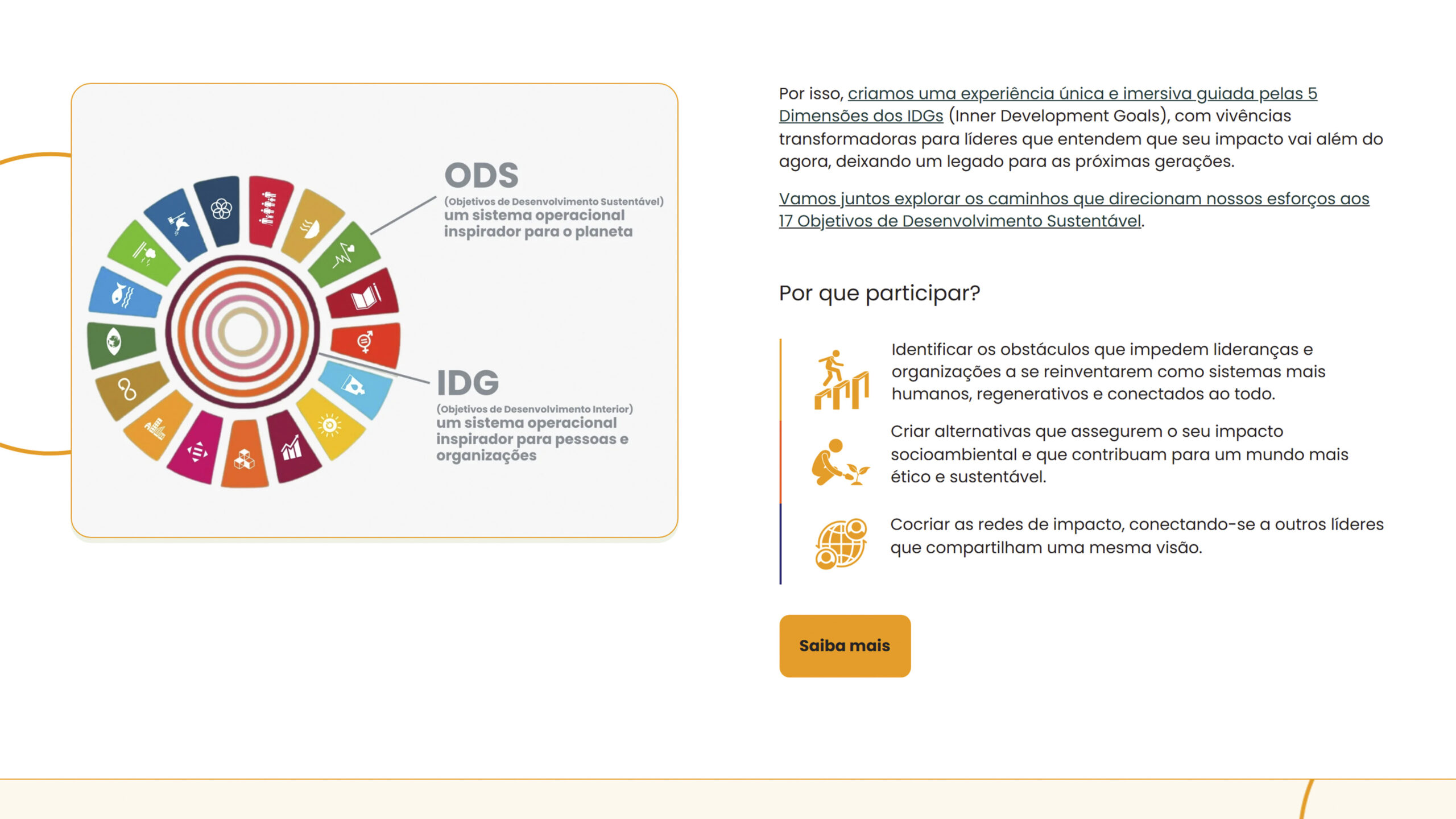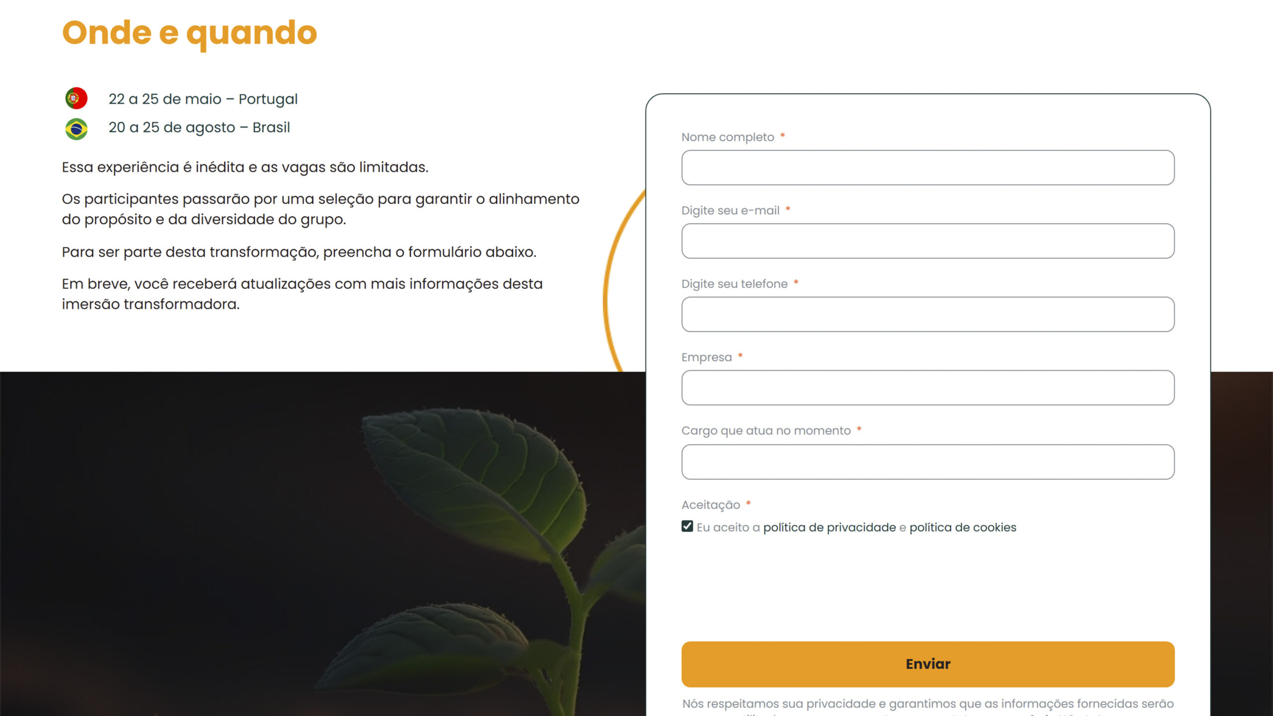 Uma consultoria especializada em desenvolvimento humano lançou uma imersão internacional para líderes de impacto, com o objetivo de preparar executivos e gestores para atuarem de forma consciente, sustentável e regenerativa. Para isso, foi criada uma landing page estratégica, com foco em engajamento, impacto e captação de inscritos.